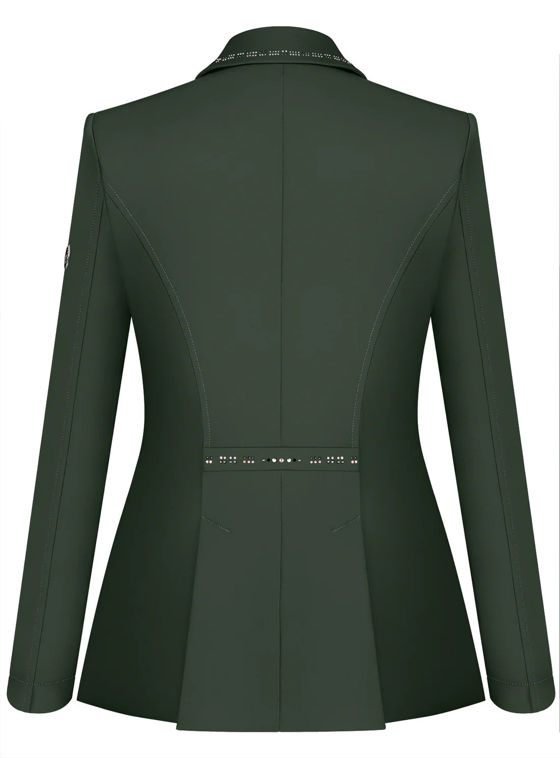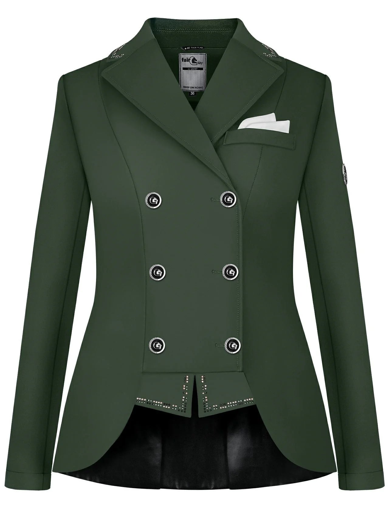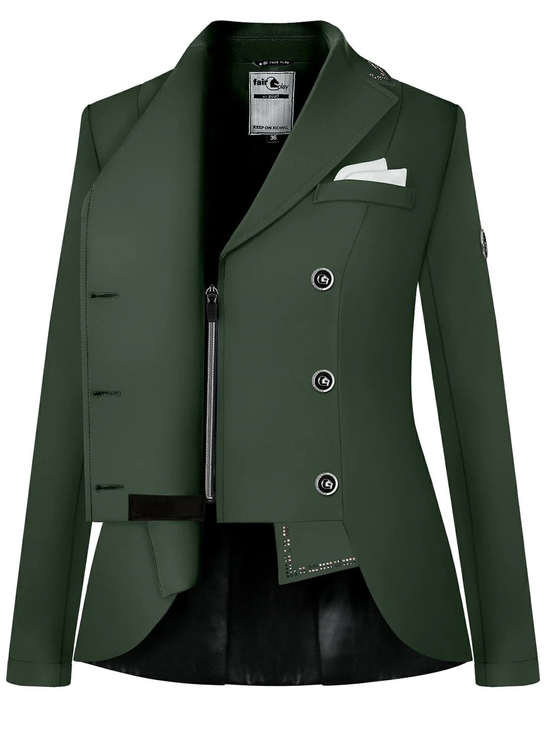 Fair Play Dressage Jacket FP Reiko - stand out from all your competitors in this truly stunning short dressage jacket from Fair Play. This short dressage frac is designed for the feminine figure, featuring two rows of buttons, as well as a hidden inside zip for an improved fit. Decorated with striking crystals on the collar, points and mid back for a stunning look. Everything has been though of in this brilliant jacket, including air vents under the arm pits for improved air flow, mesh lining for breathability as well as the tails being lined with faux leather for a brilliant finish.
